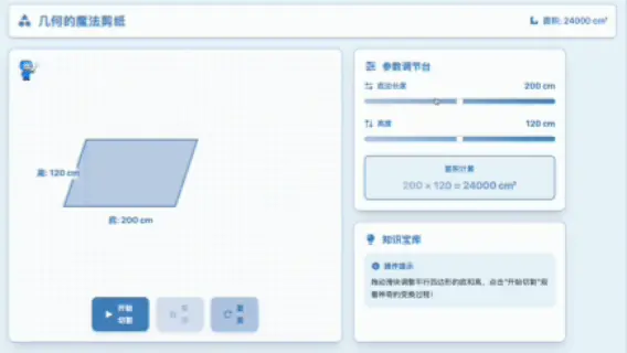 Taking the area formula of a parallelogram as an example, explaining this topic often requires showing the process of cutting and reassembly—a dynamic presentation is a crucial aid for educators. However, traditional methods like blackboard sketches or PowerPoint presentations cannot effectively demonstrate it. With MathGPT for Teachers, users can merely share a simple idea, and the AI will auto-generate a comprehensive courseware containing animated demonstrations, adjustable parameters, and knowledge explanations. Traditionally, creating such multimedia presentations would require several hours of time, along with coding and animation design expertise—skills many teachers may not possess.