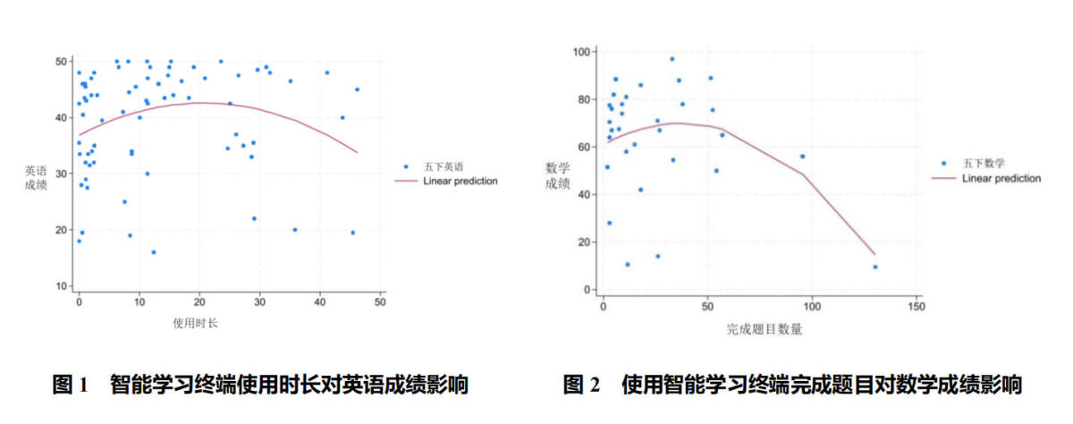 值得注意的是,研究还发现学习机使用强度与学习效果存在“倒 U 型关系”。如图所示,英语成绩随使用时长先升后降,最优使用时长约为每周22小时。数学学科同样存在类似趋势,每周完成约40道练习题时效果最佳。