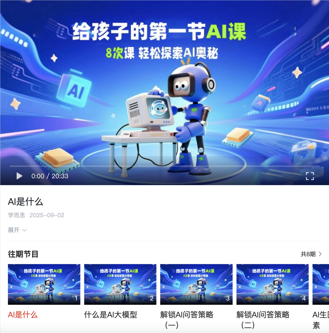 不仅如此,学而思录制的《给孩子的第一节AI课》又正式入驻“学习强国”平台,方便全国各地的大朋友小朋友都能随时随地学习AI知识。